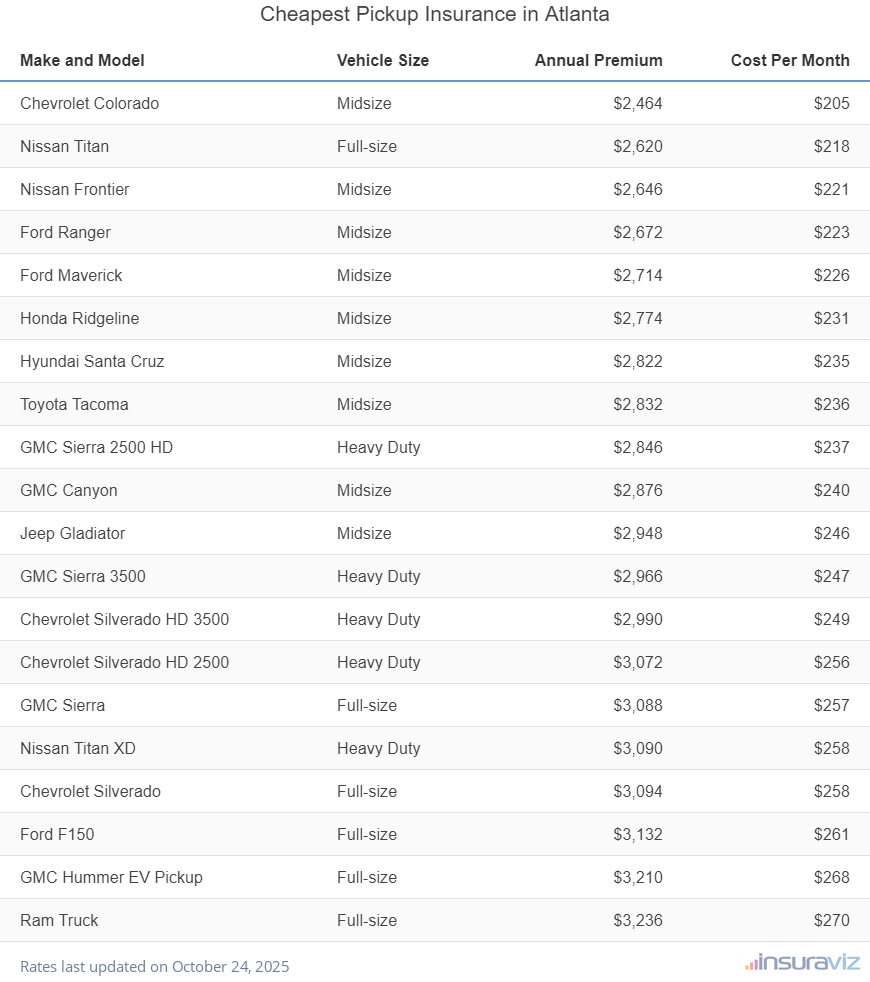 Ranking at the top of the list for the lowest-cost Atlanta car insurance rates in the pickup segment are the Chevrolet Colorado, Nissan Frontier, Ford Maverick, Nissan Titan, and Ford Ranger. Car insurance rates for these models average $2,714 or less per year.