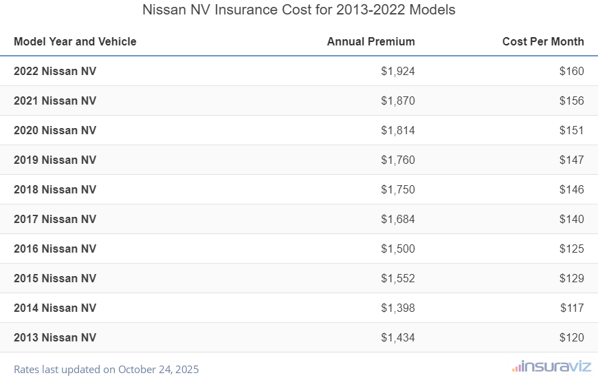 Data Methodology: Rated driver is a 40-year-old married male with no driving violations or at-fault accidents in the prior three years. Comprehensive and collision deductibles are $500 and UM/UIM and medical payments coverages are included. Premiums are averaged for all Nissan NV trim levels for each model year. Updated October 24, 2025